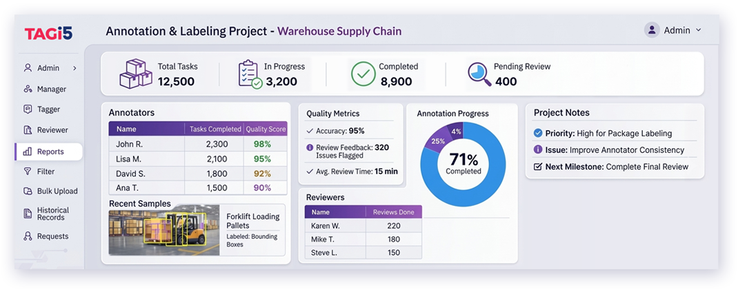 Annotate images, documents, and videos with speed, precision, and built-in governance – all in one intelligent workspace. Tagi5 helps AI teams create high-quality training data faster, with complete visibility, control, and confidence.