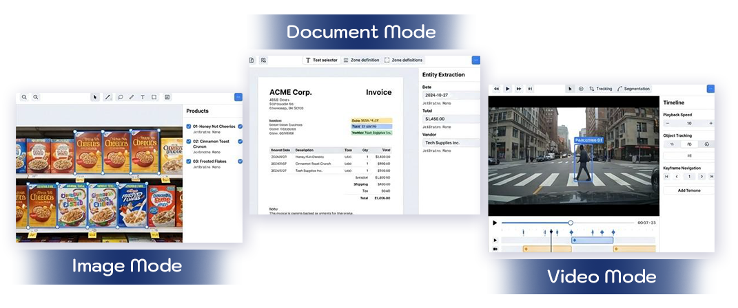 A unified workspace supporting images, documents, and videos with multiple annotation types.